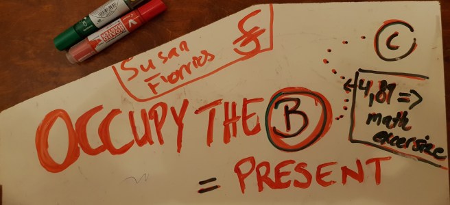 In the sign I created for this purpose, there is a little math exercise. I spelt it wrongly, “excersize” – but in a way it fits, simply since part of the answer has to do with size in a sense. Anyhow, the exercise is a combination of physics, math and mathematical philosophy. It’s marked with a green pen, but related to the red phrase “Occupy the Present”. One point of the exercise has already been defined to 4,89 by one person who I met.